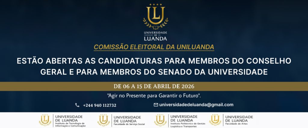 A Comissão Eleitoral da UniLuanda para a Eleição dos Membros do Conselho Geral e do Senado da Classe dos Estudantes, para o período de 2026 a 2028, no uso das competências que lhe foram conferidas através do Despacho nº 70 de 25 de Março de 2026, do Magnífico Reitor e nos termos das disposições estatutárias e regulamentos aplicáveis, comunica a todos os estudantes da UniLuanda (regularmente matriculados e em frequência lectiva, conforme disposição no nº 1, do art. 15º, do DP nº 74/22, de 3 de Fevereiro) interessados em concorrer para as vagas de membros do Conselho Geral ou do Senado, que estão abertas as candidaturas, devendo para o efeito cumprir escrupulosamente as seguintes orientações conforme o comunicado.